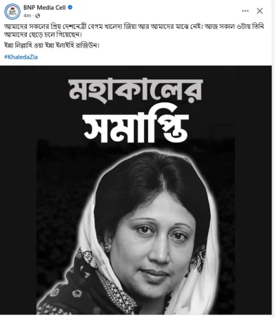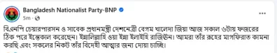 বিএনপির মিডিয়া সেল থেকে সামাজিক যোগাযোগমাধ্যম ফেসবুকে দেওয়া এক পোস্টে এ তথ্য নিশ্চিত করা হয়েছে।