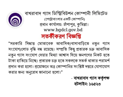 বাখরাবাদ গ্যাস ডিস্ট্রিবিউশন কম্পানি লিমিটেড এক বার্তায় বলেছে, সরকারি সিদ্ধান্ত মোতাবেক আবাসিক/বাসাবাড়িতে নতুন গ্যাস সংযোগ/লোড বৃদ্ধি বন্ধ রয়েছে। সম্প্রতি কিছু প্রতারক চক্র আবাসিক নতুন গ্যাস সংযোগ দেওয়ার মিথ্যা আশ্বাস দিয়ে জনগণের কাছ থেকে টাকা হাতিয়ে নিচ্ছে।