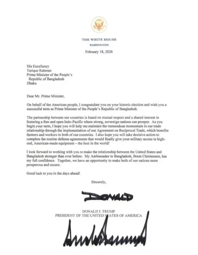 তারেক রহমানকে অভিনন্দন জানিয়ে ডোনাল্ড ট্রাম্পের চিঠি