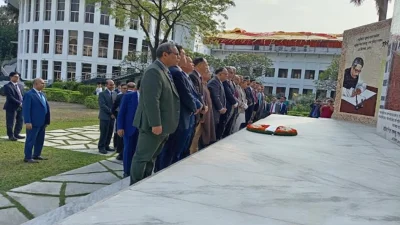 জাতীয় স্মৃতিসৌধে পুষ্পস্তবক অর্পণ শেষে ভারপ্রাপ্ত প্রধান বিচারপতি এম, ইনায়েতুর রহিম সুপ্রিম কোর্টের উভয় বিভাগের বিচারপতিদের সঙ্গে নিয়ে সকাল পৌনে ৮ টায় সুপ্রিম কোর্ট ইনার কোর্ট ইয়ার্ডে অবস্থিত ‘স্মৃতি চিরঞ্জীব’ স্মারক সৌধে পুষ্পস্তবক অর্পণ করে জাতির পিতা বঙ্গবন্ধু শেখ মুজিবুর রহমানের প্রতি শ্রদ্ধা জানান।