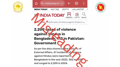 শুক্রবার (২০ ডিসেম্বর) রাতে প্রধান উপদেষ্টার প্রেস উইং ফেসবুকে এ সংক্রান্ত একটি পোস্ট দেন। CA Press Wing Facts পেজের ওই পোস্টে বলা হয়, ভারতের পররাষ্ট্র মন্ত্রণালয়ের বরাত দিয়ে ইন্ডিয়া টুডে, আনন্দবাজারসহ একাধিক ভারতীয় গণমাধ্যম জানিয়েছে, হিন্দু ধর্মাবলম্বীদের বিরুদ্ধে বাংলাদেশে ২০২২ সালে ৪৭টি, ২০২৩ সালে ৩০২টি এবং ২০২৪ সালে ২ হাজার ২০০টি সহিংসতার ঘটনা ঘটেছে। তথ্যটি বিভ্রান্তিকর এবং অতিরঞ্জিত।