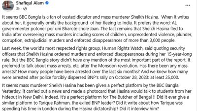 অন্তর্বর্তী সরকারের প্রধান উপদেষ্টা ড. মুহাম্মদ ইউনূসের প্রেস সচিব শফিকুল আলম বলেছেন, বিবিসি বাংলা গণহত্যাকারী শেখ হাসিনাকে একটি নিখুঁত প্ল্যাটফর্ম দিয়েছে। আপাতদৃষ্টিতে মনে হচ্ছে বিবিসি বাংলা ক্ষমতাচ্যুত স্বৈরশাসক ও গণহত্যাকারী শেখ হাসিনার ভক্ত।