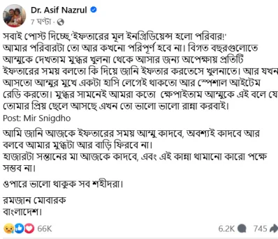 রোজায় কেমন কাটবে শহিদ পরিবারের ইফতার; তা নিয়ে ফেসবুকে আবেগঘন একটি পোস্ট শেয়ার করেছেন অন্তর্বর্তী সরকারের আইন উপদেষ্টা অধ্যাপক আসিফ নজরুল।