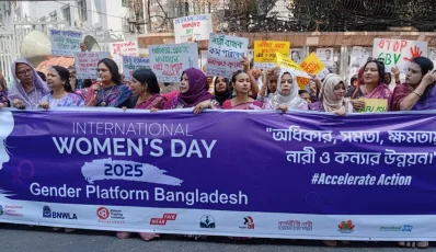 নারীর প্রতি হয়রানি ও নির্যাতন রোধে শনিবার( ৮ মার্চ) জাতীয় প্রেস ক্লাবের সামনে জেন্ডার প্ল্যাটফর্ম বাংলাদেশ আয়োজিত মানববন্ধন ও বিক্ষোভ প্রদর্শন করেছে। বিক্ষোভ সমাবেশে বক্তরা নারী নির্যাতন বন্ধে আইনের কঠোর প্রয়োগ ও ধর্ষণকারীর দৃষ্টান্তমূলক শাস্তির দাবি জানান। তারা বলেছেন, আন্তর্জাতিক নারী দিবস-২০২৫ উপলক্ষে ‘কর্মক্ষেত্র ও শিক্ষা প্রতিষ্ঠানসহ সকল ক্ষেত্রে যৌন হয়রানি প্রতিরোধ ও সুরক্ষা আইন প্রণয়ন ও বাস্তবায়ন, কর্মক্ষেত্রে যৌন হয়রানি প্রতিরোধ কমিটি গঠন সংক্রান্ত হাইকোর্টের নির্দেশনা বাস্তবায়ন এবং আইএলও কনভেনশন ১৯০ অনুসমর্থনের দাবী জানান।