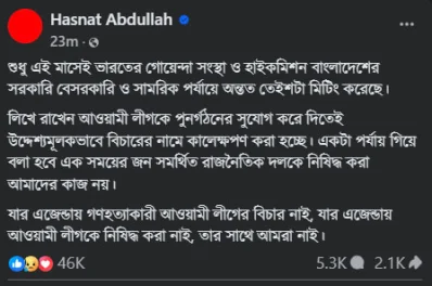 এ ছাড়া দ্বিতীয় ট্রাইব্যুনাল জানুয়ারিতে হওয়ার কথা থাকলেও মে মাসে এসেও শুরু হয়নি জানিয়ে আওয়ামী লীগের বিচার নিশ্চিতে সরকারের অবস্থান নিয়ে প্রশ্ন তোলেন হাসনাত। অন্তর্বর্তী সরকার এখন পর্যন্ত কী কী বিচার ও সংস্কার করেছে সে সম্পর্কেও জানতে চান হাসনাত আবদুল্লাহ।