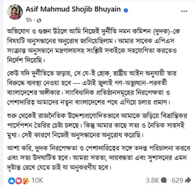 আসিফ মাহমুদ তার পোস্টে বলেন, অভিযোগ ও গুঞ্জন উঠলে আমি নিজেই দুর্নীতি দমন কমিশনকে (দুদক) বিষয়টি অনুসন্ধানের অনুরোধ জানিয়েছিলাম। আমার সাবেক এপিএস সংক্রান্ত অনুসন্ধানে মন্ত্রণালয়সহ সংশ্লিষ্ট সবাইকে সহযোগিতা করতেও নির্দেশ দিয়েছি।