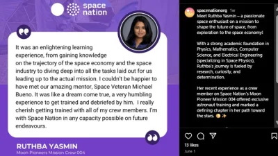 তার স্বপ্ন এখন আরও বড়: “আমি চাই চাঁদে পা রাখা প্রথম বাংলাদেশি নারী হতে—এটি হবে শুধু আমার জন্য নয়, বরং বাংলাদেশের এবং বৈশ্বিক মহাকাশ গবেষণার এক ঐতিহাসিক অধ্যায়।”