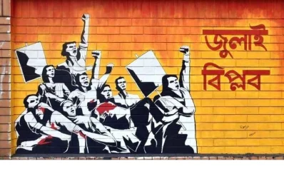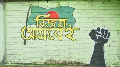 শাহজালাল বিজ্ঞান ও প্রযুক্তি বিশ্ববিদ্যালয়ের (শাবি) শিক্ষার্থীরা আবু সাঈদের হাত উঁচিয়ে গুলির সামনে বুক পেতে দেওয়ার গ্রাফিতি আঁকেন।