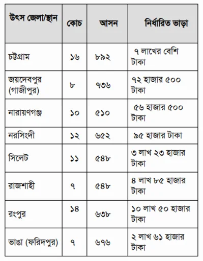 রাজশাহী থেকে ঢাকার পথে ট্রেন আসবে ৭টি কোচ নিয়ে। এতে আসন থাকবে ৫৪৮টি। এই ট্রেনটির জন্য ভাড়া নির্ধারণ করা হয়েছে ৪ লাখ ৮৫ হাজার টাকা। ১৪টি কোচ নিয়ে একটি বিশেষ ট্রেন আসবে রংপুর থেকে। এতে যাত্রী আসন থাকবে ৬৩৮টি। এই ট্রেনটির জন্য ভাড়া নির্ধারণ করা হয়েছে প্রায় সাড়ে ১০ লাখ টাকা। ফরিদপুরের ভাঙা থেকে ৭টি কোচ নিয়ে একটি ট্রেন আসবে। এতে আসনসংখ্যা হবে ৬৭৬টি। এই ট্রেনের ভাড়া প্রায় ২ লাখ ৬১ হাজার টাকা।