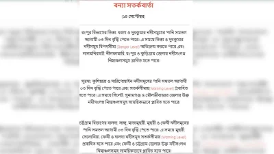 সতর্কবার্তায় বলা হয়েছে, রংপুর বিভাগের তিস্তা, ধরলা ও দুধকুমার নদীর পানি সমতল আগামী তিন দিন বৃদ্ধি পেতে পারে। এ সময়ে তিস্তা ও দুধকুমার নদী বিপৎসীমা অতিক্রম করতে পারে এবং লালমনিরহাট, নীলফামারী, রংপুর ও কুড়িগ্রাম জেলার নদীসংলগ্ন নিম্নাঞ্চল প্লাবিত হতে পারে।