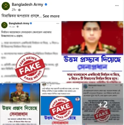 ফেসবুক বার্তায় জানানো হয়, ‘ইদানিং পরিলক্ষিত হচ্ছে, সামাজিক যোগাযোগ মাধ্যমে বাংলাদেশ সেনাবাহিনী প্রধানকে জড়িয়ে নির্বাচন পরিচালনা সংক্রান্ত বিভিন্ন অপপ্রচার চালানো হচ্ছে। জনসাধারণকে মিথ্যা ও ভিত্তিহীন প্রচারণা থেকে সতর্ক থাকতে বিনীতভাবে অনুরোধ জানানো যাচ্ছে।’