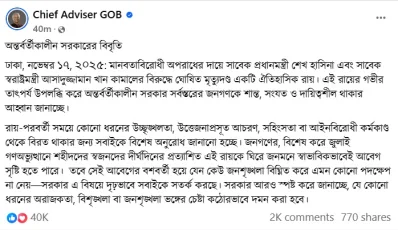 বিবৃতিতে বলা হয়, ‘মানবতাবিরোধী অপরাধের দায়ে সাবেক প্রধানমন্ত্রী শেখ হাসিনা এবং সাবেক স্বরাষ্ট্রমন্ত্রী আসাদুজ্জামান খান কামালের বিরুদ্ধে ঘোষিত মৃত্যুদণ্ড একটি ঐতিহাসিক রায়। এই রায়ের গভীর তাৎপর্য উপলব্ধি করে অন্তর্বর্তীকালীন সরকার সর্বস্তরের জনগণকে শান্ত, সংযত ও দায়িত্বশীল থাকার আহ্বান জানাচ্ছে। রায়-পরবর্তী সময়ে কোনো ধরনের উচ্ছৃঙ্খলতা, উত্তেজনাপ্রসূত আচরণ, সহিংসতা বা আইনবিরোধী কর্মকাণ্ড থেকে বিরত থাকার জন্য সবাইকে বিশেষ অনুরোধ জানানো হচ্ছে।’