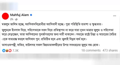 পোস্টে তিনি লেখেন, ‘বর্তমান পরিস্থিতি হতাশা ও ক্ষোভে ভরা। যারা জুলুমকে ইনসাফ দিয়ে প্রতিস্থাপন না করে নতুন মাত্রার সহিংসতা ও জুলুম করছে, তাদের কর্মকাণ্ডই ফ্যাসিবাদের পুনর্জাগরণকে ত্বরান্বিত করছে।’