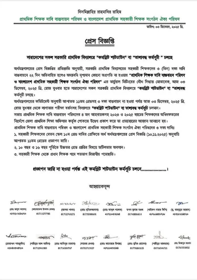 বুধবার (৩ ডিসেম্বর) এক বিজ্ঞপ্তিতে বলা হয়, অর্থ মন্ত্রণালয়ের প্রেস বিজ্ঞপ্তির প্রতিশ্রুতি অনুযায়ী, সরকারি প্রাথমিক বিদ্যালয়ের সহকারী শিক্ষকদের তিন দফা দাবি বাস্তবায়নে ২২ দিন অতিবাহিত হলেও অদ্যাবধি দৃশ্যমান কোনো অগ্রগতি না হওয়ায় ‘প্রাথমিক শিক্ষক দাবি বাস্তবায়ন পরিষদ ও বাংলাদেশ প্রাথমিক সহকারী শিক্ষক সংগঠন ঐক্য পরিষদ’ এর ভার্চুয়াল মিটিংয়ের যৌথ সিদ্ধান্ত মোতাবেক বুধবার হতে দেশের সকল সরকারি প্রাথমিক বিদ্যালয়ে ‘কমপ্লিট শাটডাউন’ বা ‘তালাবদ্ধ’ কর্মসূচী চলছে।