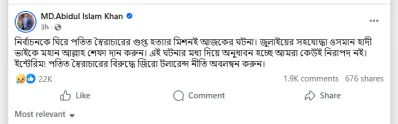 পোস্টে তিনি লেখেন, নির্বাচনকে ঘিরে পতিত স্বৈরাচারের গুপ্ত হত্যার মিশনই আজকের ঘটনা। জুলাইয়ের সহযোদ্ধা ওসমান হাদী ভাইকে মহান আল্লাহ শেফা দান করুন। এই ঘটনার মধ্য দিয়ে অনুধাবন হচ্ছে আমরা কেউই নিরাপদ নই। ইন্টেরিম! পতিত স্বৈরাচারের বিরুদ্ধে জিরো টলারেন্স নীতি অবলম্বন করুন।