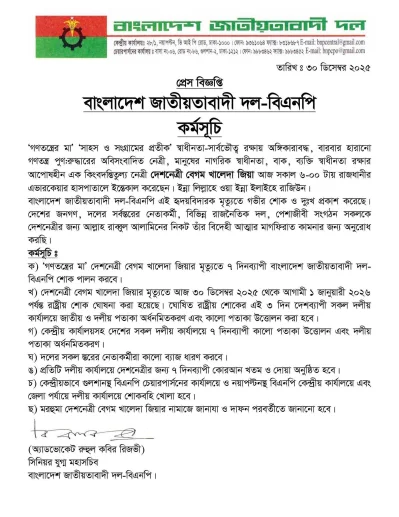 দেশনেত্রীর মৃত্যুতে বিএনপি কেন্দ্রীয়ভাবে ৭ দিনব্যাপী শোক কর্মসূচি ঘোষণা করেছে। কর্মসূচির বিস্তারিত নিচে তুলে ধরা হলো: