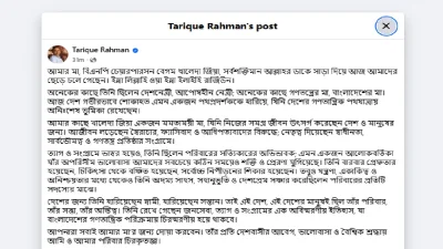 ‘আমার মা, বিএনপি চেয়ারপারসন বেগম খালেদা জিয়া, সর্বশক্তিমান আল্লাহর ডাকে সাড়া দিয়ে আজ আমাদের ছেড়ে চলে গেছেন। ইন্না লিল্লাহি ওয়া ইন্না ইলাইহি রাজিউন।