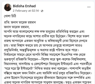তারেক রহমানের বিভিন্ন রাজনৈতিক সমাবেশে দেওয়া নির্বাচনী প্রতিশ্রুতির কথা উল্লেখ করে বিদিশা লেখেন, স্কুল, কলেজ ও বিশ্ববিদ্যালয়সহ বিমানবন্দর, বাসস্ট্যান্ড এবং রেলস্টেশনে বিনামূল্যে ইন্টারনেট সুবিধা চালু করা এবং পর্যায়ক্রমে ঘরে ঘরে ফ্রি ইন্টারনেট পৌঁছে দেওয়ার ঘোষণা ইতোমধ্যে মানুষের মধ্যে আগ্রহ তৈরি করেছে। পাশাপাশি কড়াইল বস্তিতে বহুতল ভবন নির্মাণ ও ফ্যামিলি কার্ড চালুর প্রতিশ্রুতিকেও তিনি জনগণের জীবনমান উন্নয়নের সঙ্গে সংশ্লিষ্ট উদ্যোগ হিসেবে উল্লেখ করেন।