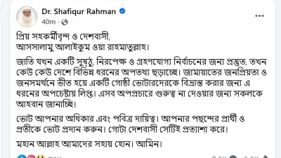 স্ট্যাটাসে জামায়াতে ইসলামীর আমির বলেন, ‘জাতি যখন একটি সুষ্ঠু, নিরপেক্ষ ও গ্রহণযোগ্য নির্বাচনের জন্য প্রস্তুত, তখন কেউ কেউ দেশে বিভিন্ন ধরনের অপতথ্য ছড়াচ্ছে। জামায়াতের জনপ্রিয়তা ও জনসমর্থনে ভীত হয়ে একটি গোষ্ঠী ভোটারদের বিভ্রান্ত করার জন্য এ ধরনের অপচেষ্টায় লিপ্ত। এসব অপপ্রচারে গুরুত্ব না দেওয়ার জন্য সবাইকে আহ্বান জানাচ্ছি।’