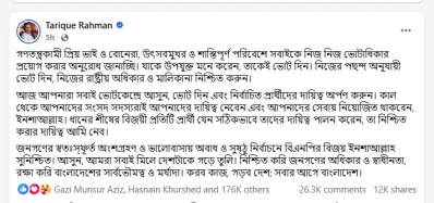 এর আগে সকালে ফেসবুকে আরেক পোস্টে তারেক রহমান লিখেছেন, ‘গণতন্ত্রকামী প্রিয় ভাই ও বোনেরা, উৎসবমুখর ও শান্তিপূর্ণ পরিবেশে সবাইকে নিজ নিজ ভোটাধিকার প্রয়োগ করার অনুরোধ জানাচ্ছি। যাকে উপযুক্ত মনে করেন, তাকেই ভোট দিন। নিজের পছন্দ অনুযায়ী ভোট দিন, নিজের রাষ্ট্রীয় অধিকার ও মালিকানা নিশ্চিত করুন।’