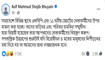 আসিফ মাহমুদ তার পোস্টে লিখেন, ‘সারাদেশে বিভিন্ন স্থানে এনসিপি এবং ১১ দলীয় জোটের নেতাকর্মীদের ওপর হামলা করা হচ্ছে। তাদের বাড়িঘর এবং পরিবার হুমকির সম্মুখীন। যারা বিজয়ী হয়েছেন তারা আপনাদের নেতাকর্মীদের নিয়ন্ত্রণ করুন।’