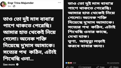 গ্রেপ্তারের দুই ঘণ্টা পর রাত সাড়ে ১০টায় নিজের ফেসবুক আইডিতে একটি স্ট্যাটাস দেন সাধন চন্দ্র মজুমদারের ছোট মেয়ে তৃণা মজুমদার।
