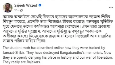 ছাত্র আন্দোলনকারীরা নিজেরাই জাতির সামনে নিজেদের রাজাকার হিসেবে পরিচয় করিয়ে দিয়েছেন বলে মন্তব্য করেছেন সাবেক প্রধানমন্ত্রী শেখ হাসিনার ছেলে সজীব ওয়াজেদ জয়।