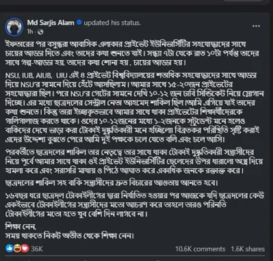 ১৬ বছর ধরে ছাত্রদল টোকাই লীগের দ্বারা নির্যাতিত হওয়ার পর আজকে যদি ছাত্রদলের কেউ একইভাবে টোকাই লীগের সন্ত্রাসীদের মতো আচরণ করে তাহলে তারও পরিণতি টোকাই লীগের মতো হতে খুব বেশি দিন লাগবে না! শিক্ষা নেন, সময় থাকতে নিকট অতীত থেকে শিক্ষা নেন এমন মন্তব্য করে তার ভ্যারিফাইড ফেসবুকে পোস্ট দিয়েছেন জাতীয় নাগরিক পার্টির (এনসিপি) মুখ্য সংগঠক (উত্তরাঞ্চল) সারজিস আলম।