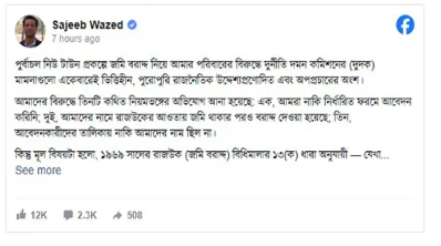 পূর্বাচল নিউ টাউন প্রকল্পে জমি বরাদ্দ নিয়ে আমার পরিবারের বিরুদ্ধে দুর্নীতি দমন কমিশনের (দুদক) মামলাগুলো একেবারেই ভিত্তিহীন, পুরোপুরি রাজনৈতিক উদ্দেশ্যপ্রণোদিত এবং অপপ্রচারের অংশ বলে অভিযোগ তুলেছেন বাংলাদেশের ক্ষমতাচ্যুত সাবেক প্রধানমন্ত্রী শেখ হাসিনার ছেলে সজীব ওয়াজেদ জয়।