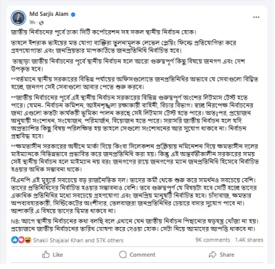 সারজিস আলম লিখেছেন, বিএনপি এই মুহূর্তে সবচেয়ে বড় রাজনৈতিক দল। তাদের কর্মী থেকে শুরু করে সমর্থনও সবচেয়ে বেশি। তাদের প্রতিনিধিদের নির্বাচিত হওয়ার সম্ভাবনাও বেশি। তবে গুরুত্বপূর্ণ যে বিষয়টা হবে, সেটি হচ্ছে তাদের একাধিক প্রতিনিধির মধ্যে সবচেয়ে গ্রহণযোগ্য এবং জনপ্রিয় মানুষটি নির্বাচিত হবে। চাঁদাবাজ, ক্ষমতার অপব্যবহারকারী, সিন্ডিকেটের অংশীদার, তেলবাজরা জনপ্রতিনিধির চেয়ারে বসার সুযোগ পাবে না। আশা করি, এ বিষয়ে তাদের দ্বিমত থাকবে না।