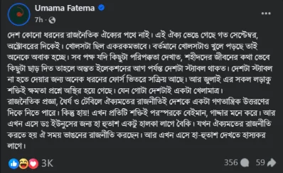 উমামা ফাতেমা আরও বলেন, রাজনৈতিক প্রজ্ঞা, ধৈর্য ও টেবিলে ঐক্যমতের রাজনীতিই দেশকে একটা গণতান্ত্রিক উত্তরণের দিকে নিতে পারে। কিন্তু হায়! এখন প্রতিটি শক্তিই পরস্পরকে বেইমান, গাদ্দার মনে করে। আর এখন এসে ড. ইউনুসের জন্য হা হুতাশ একটু হালকা লাগে বৈকি। যখন ঐক্যমতের রাজনীতি করতে হয় ঐ সময় ভাঙনের রাজনীতি করছেন। আর এখন এসে হা-হুতাশ দেখতে হাস্যকর লাগে।