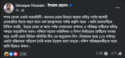 শুক্রবার (২৩ মে) ভেরিফায়েড ফেসবুক আইডিতে দেওয়া পোস্টে ইশরাক লিখেন, শপথ কেবল একটা ফরমালিটি। জনতার মেয়র হিসেবে আমার দায়িত্ব বর্তায় আগামী কোরবানির ঈদের আগে যাতে বর্জ্য ব্যবস্থাপনার পর্যাপ্ত প্রস্তুতি থাকে।