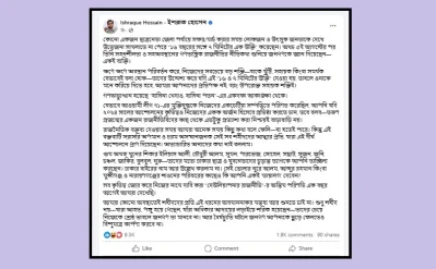 সবশেষ ইশরাক হোসেন আরও লিখেছেন, সব কৃতিত্ব জোর করে নিজের নামে দাবি করা ‘দেউলিয়াপনার রাজনীতি’র অন্তিম পরিণতি এক বছর আগেই আমরা দেখেছি। আমরা কোনো অবস্থাতেই শহীদদের প্রতি এই ধরনের অবমাননাকর মন্তব্য আর শুনতে চাই না। শুধু শহীদ নয়- যারা আহত, পঙ্গু হয়ে গেছেন, যারা অধিকার আদায়ের লড়াইয়ে শরিক হয়েছেন- তাদের চেয়ে নিজেকে শ্রেষ্ঠ ভাবলে জনগণ তা মানবে না। আর ধৈর্যচ্যুতি ঘটলে জনগণ আপনাকে ছুড়ে ফেলতেও বিন্দুমাত্র কার্পণ্য করবে না।’