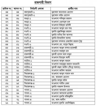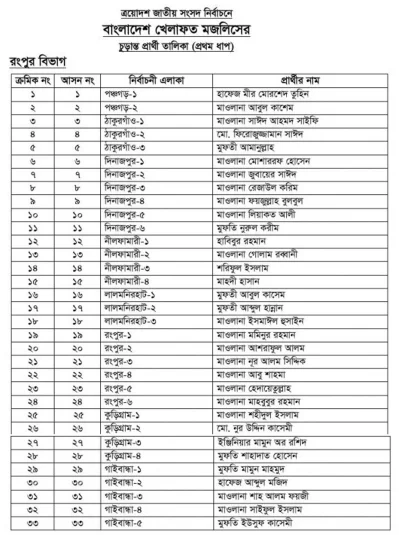 আসন্ন ত্রয়োদশ জাতীয় সংসদ নির্বাচনে অংশগ্রহণের লক্ষ্যে প্রথম ধাপে মোট ২২৩ আসনে দলীয় প্রার্থীদের নাম ঘোষণা করেছে বাংলাদেশ খেলাফত মজলিস।