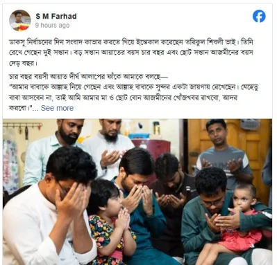 জিএস ফরহাদ তার ফেসবুক পোস্টে লেখেন, ‘চার বছরের ছোট্ট আয়াত আমাকে বলেছে— আমার বাবাকে আল্লাহ নিয়ে গেছেন এবং সুন্দর জায়গায় রেখেছেন। যেহেতু বাবা আসবেন না, তাই আমি মা ও ছোট বোন আজমীনের খোঁজখবর রাখবো, আদর করবো। অবুঝ শিশুর মুখে এমন ভারি কথা আমাদের সবাইকে গভীরভাবে নাড়া দিয়েছে।’