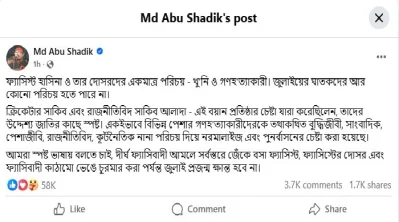 স্ট্যাটাসে সাদিক লিখেছেন, ফ্যাসিস্ট হাসিনা ও তার দোসরদের একমাত্র পরিচয় খুনি ও গণহত্যাকারী। জুলাইয়ের ঘাতকদের আর কোনো পরিচয় হতে পারে না। ক্রিকেটার সাকিব এবং রাজনীতিবিদ সাকিব আলাদা এই বয়ান প্রতিষ্ঠার চেষ্টা যারা করেছিলেন, তাদের উদ্দেশ্য জাতির কাছে স্পষ্ট। একইভাবে বিভিন্ন পেশার গণহত্যাকারীদেরকে তথাকথিত বুদ্ধিজীবী, সাংবাদিক, পেশাজীবী, রাজনীতিবিদ, কূটনৈতিক নানা পরিচয় দিয়ে নরমালাইজ এবং পুনর্বাসনের চেষ্টা করা হয়েছে। আমরা স্পষ্ট ভাষায় বলতে চাই, দীর্ঘ ফ্যাসিবাদী আমলে সর্বস্তরে জেঁকে বসা ফ্যাসিস্ট, ফ্যাসিস্টের দোসর এবং ফ্যাসিবাদী কাঠামো ভেঙে চুরমার করা পর্যন্ত জুলাই প্রজন্ম ক্ষান্ত হবে না।