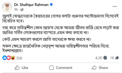 জামায়াত আমির লেখেন, ‘দয়া করে দায়িত্বশীল কোনো জায়গা থেকে আমরা জীবন বাজি রেখে লড়াই করা জাতির গর্বিত লোকগুলোর ব্যাপারে এমন কথা বলবো না। কেউ এমন আচরণ করলে জাতি তাদেরকে ক্ষমা করবে না।’