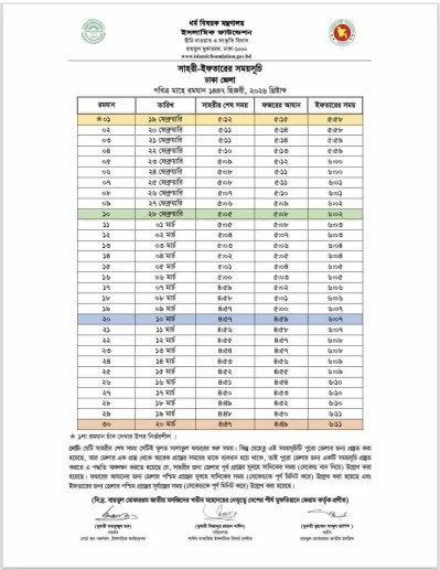 ইসলামিক ফাউন্ডেশনের প্রকাশিত ক্যালেন্ডার অনুযায়ী, ১৯ ফেব্রুয়ারি প্রথম রমজানে ঢাকা জেলার জন্য সময়সীমা নির্ধারণ করা হয়েছে:
