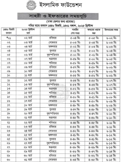 মঙ্গলবার (১১ মার্চ) রমজানের ১০ম দিনে সেহরির শেষ সময় হবে ভোর ৪টা ৫৫ মিনিট এবং ইফতার হবে সন্ধ্যা ৬টা ০৬ মিনিটে।