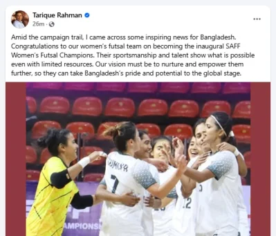 পোস্টে তিনি লিখেছেন, নির্বাচনি প্রচারণার মধ্য দিয়ে, আমি বাংলাদেশের জন্য কিছু অনুপ্রেরণামূলক খবর পেলাম। সাফ নারী ফুটসালে প্রথমবার চ্যাম্পিয়ন হওয়ার জন্য আমাদের নারী ফুটসাল দলকে অভিনন্দন জানায়।
