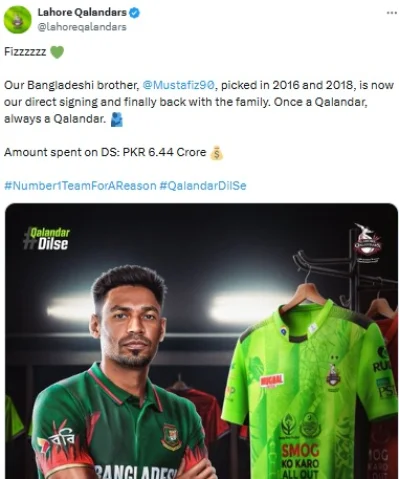 আনুষ্ঠানিক এক বিবৃতিতে লাহোর জানিয়েছে, আমাদের বাংলাদেশি ভাই, মোস্তাফিজুর রহমান যাকে ২০১৬ এবং ২০১৮ সালে দলে নেওয়া হয়েছিল, এখন আমাদের সঙ্গে সরাসরি চুক্তিবদ্ধ। অবশেষে পরিবারের মাঝে আবারও ফিরে এসেছেন।