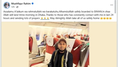 দীর্ঘ উৎকণ্ঠার পর রোববার (১ মার্চ) দিবাগত রাতে নিজের ভেরিফায়েড ফেসবুক পেজে একটি পোস্টের মাধ্যমে দেশবাসীকে আশ্বস্ত করেন মুশফিক। তিনি লেখেন, ‘বাড়ির পথে, আলহামদুলিল্লাহ। নিরাপদে বিমানের ফ্লাইটে চেপে বসেছি। ইনশাআল্লাহ কাল সকালে ঢাকা থাকব। গত ২৪ ঘণ্টায় যারা নিয়মিত আমার সঙ্গে যোগাযোগ করেছেন এবং দোয়া করেছেন তাদের ধন্যবাদ। আল্লাহ যেন আমাদের নিরাপদে বাড়ি পৌঁছে দেন।’