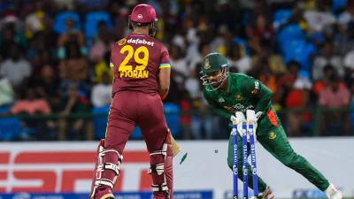 উইকেট ছেড়ে বেরিয়ে এসে বড় শট খেলতে চেয়েছিলেন নিকোলাস পুরান। লেন্থ ছিল বিপক্ষে। মিস করলেন। লিটন বল গ্লাভসে নিয়ে স্টাম্পস ভাঙতে সময় নেননি। ২ রানে ২ উইকেট হারায় ওয়েস্ট ইন্ডিজ।