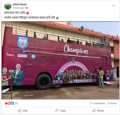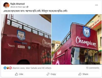 সাইয়েদ আবদুল্লাহ নামে এক জন তার ফেসবুকে দুটি ছবি পোস্ট করে লিখেন, ‘সাফ ফুটবল চ্যাম্পিয়নশিপ জয়ী বাংলাদেশের নারীদলকে বরণ করার জন্য তৈরি ছাদখোলা বাসের আয়োজনেও পার্থক্যটা দেখতে পারবেন! স্বৈরাচার এমনভাবেই জেঁকে বসেছিলো যে ফুটবলারদের বরণ করার বাসেও এভাবে নির্লজ্জভাবে ফুটবলারদের চেয়েও বড় করে তাদের ছবি এঁকে রাখতো!