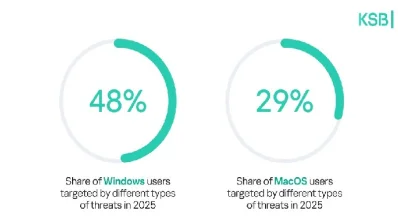 ২০২৫ সালে উইন্ডোজ ব্যবহারকারীরা সবচেয়ে বেশি সাইবার ঝুঁকির মুখে ছিলেন। মোট হামলার ৪৮ শতাংশ উইন্ডোজ, আর ২৯ শতাংশ ম্যাক ব্যবহারকারীর বিরুদ্ধে পরিচালিত হয়েছে। বিশ্বব্যাপী ২৭ শতাংশ ব্যবহারকারী অনলাইন-ভিত্তিক আক্রমণের শিকার হয়েছেন, এবং ৩৩ শতাংশ ডিভাইস-ভিত্তিক হামলার মুখোমুখি হয়েছেন, যেখানে- ইউএসবি, ডিস্ক বা ইনস্টলারের মাধ্যমে ম্যালওয়্যার ছড়ানো হয়েছে।