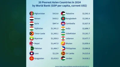 এদিকে এশিয়ার ২০টি নিম্ন আয়ের দেশের তালিকায় মাথাপিছু জিডিপির ভিত্তিতে শীর্ষ অবস্থানে আছে জর্ডান। দেশটির মাথাপিছু জিডিপি ৪ হাজার ৬১৮ ডলার। এই তালিকায় ২ হাজার ৫৯৩ ডলার মাথাপিছু জিডিপি নিয়ে বাংলাদেশের অবস্থান ১২তম।