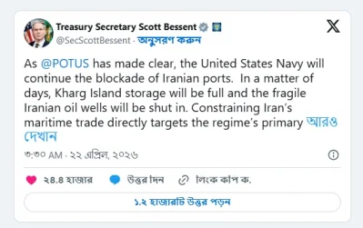 মঙ্গলবার (৩১ মার্চ) সামাজিক যোগাযোগমাধ্যম এক্সে পোস্ট করা এক বার্তায় বেসেন্ট বলেন, ‘প্রেসিডেন্ট ডোনাল্ড ট্রাম্প পরিষ্কার বলেছেন যে ইরানের বন্দরগুলোতে মার্কিন নৌবাহিনীর অবরোধ অব্যাহত থাকবে।’