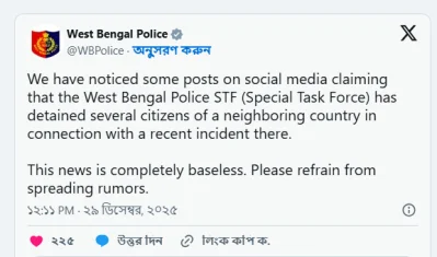 এক্সে দেওয়া পোস্টে পশ্চিমবঙ্গ পুলিশ বলেছে, ‘আমরা সামাজিক যোগাযোগমাধ্যমে কিছু পোস্ট লক্ষ্য করেছি যেখানে দাবি করা হয়েছে, পশ্চিমবঙ্গ পুলিশের এসটিএফ (স্পেশাল টাস্ক ফোর্স) সাম্প্রতিক একটি ঘটনার সাথে জড়িত থাকার অভিযোগে প্রতিবেশী দেশের কয়েকজন নাগরিককে আটক করেছে।’