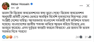 প্রেস মিনিস্টার আকবর হোসেন ফেসবুক পোস্টে বলেন, ‘ভারত কি ভিয়েনা কনভেনশনের কথা ভুলে গেছে? ভিয়েনা কনভেনশন অনুযায়ী প্রতিটি দেশের ভেতরে অবস্থিত বিদেশি দূতাবাসের নিরাপত্তা দেয়া সংশ্লিষ্ট দেশের দায়িত্ব। আগরতলায় বাংলাদেশ সহকারী হাই কমিশনে হামলা হয়েছে। বাংলাদেশের জাতীয় পতাকা নামিয়ে আগুন ধরিয়ে দিয়েছে এবং ভাঙচুর করেছে। এসব দুর্বৃত্তরা কাজটা করলো কিভাবে? এর জবাব কি ভারত সরকার দিতে পারবে?’